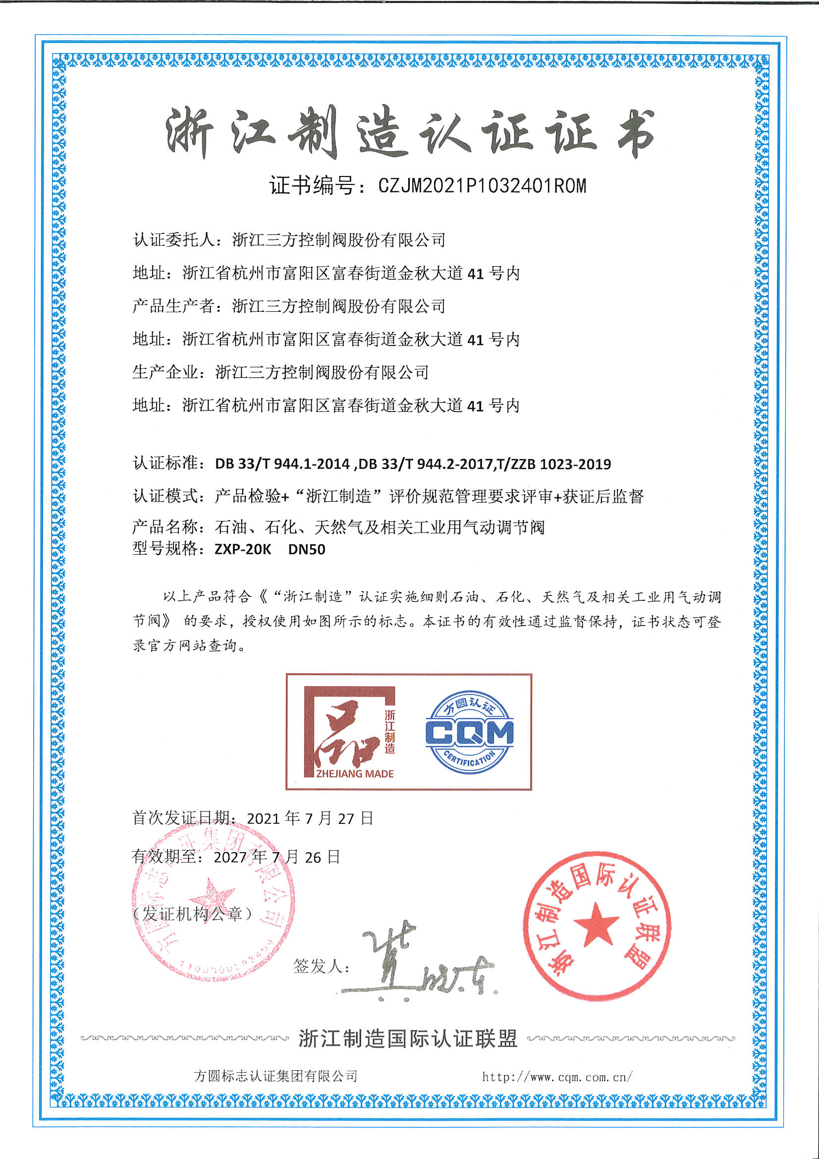 2016年,公司调节阀、球阀、蝶阀取得了SIL安全完整性等级认证。