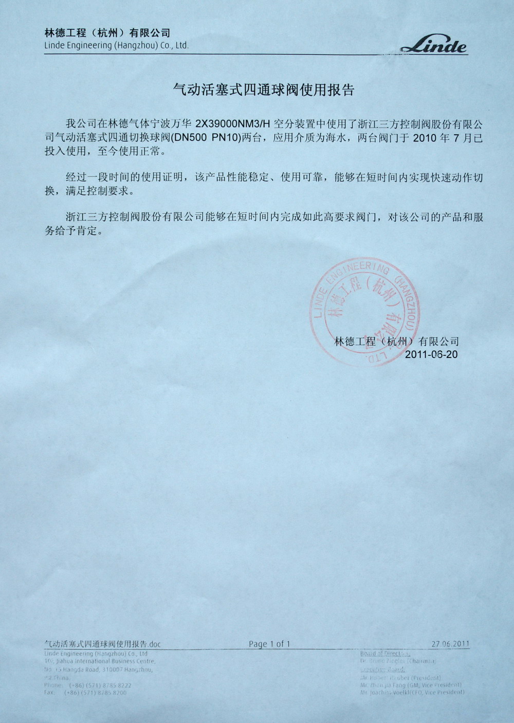 宁波万华四通切换球阀使用报告